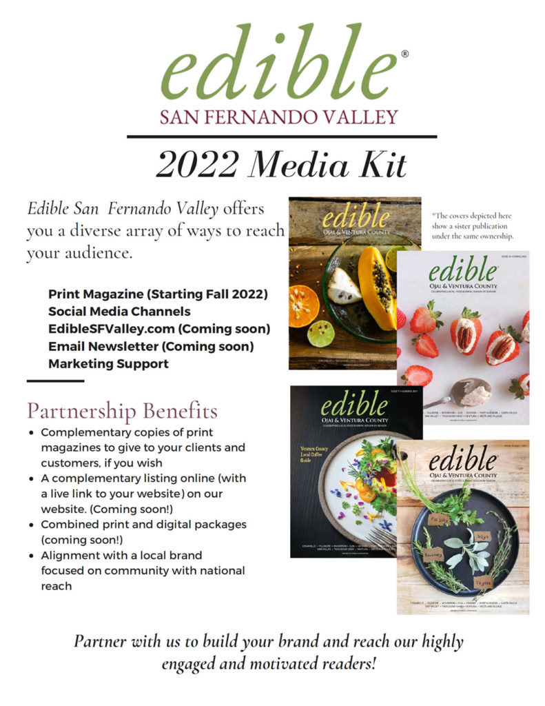 Edible San Fernando Valley is a seasonal magazine – with four issues annually – that promotes the abundance of local food and food producers in the Valley and reaches tens of thousands of informed readers who support local businesses and truly care about where they get their food. We celebrate the family farmers, food and beverage artisans, chefs, and other food-related businesses for their dedication to providing the highest quality, fresh, seasonal foods and beverages. Contact us to plan your advertising partnership: e-mail sales@ediblesanfernandovalley.com and click on our media kit link for more information, deadlines, specs and rates.